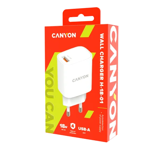 Utiliza este cargador de pared Canyon CNE-CHA18W para cargar rápidamente cualquier dispositivo con un cable USB-A y protocolo QC3.0. La potencia de 18 vatios y la tecnología Quick Charge 3.0 proporcionan la máxima velocidad de carga y la detección automática de la potencia del dispositivo que se está cargando, lo que te permite proporcionar la corriente óptima para tu dispositivo. Además, el adaptador Canyon CNE-CHA18W está protegido de manera confiable contra cortocircuitos, sobrecarga de corriente, sobrecalentamiento y sobretensión. ¡Nueva tecnología en un formato clásico!